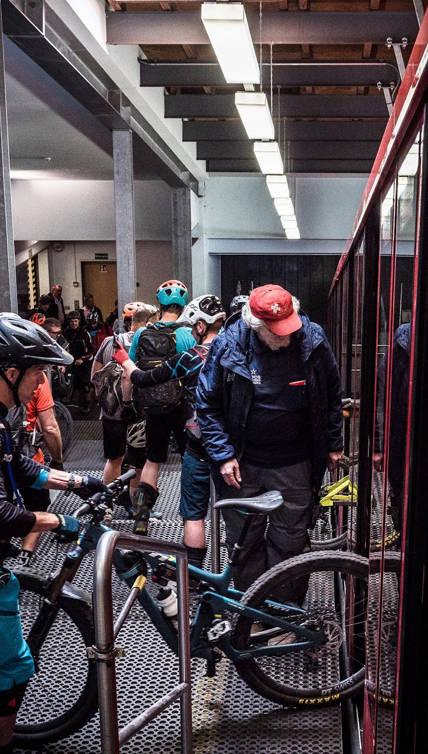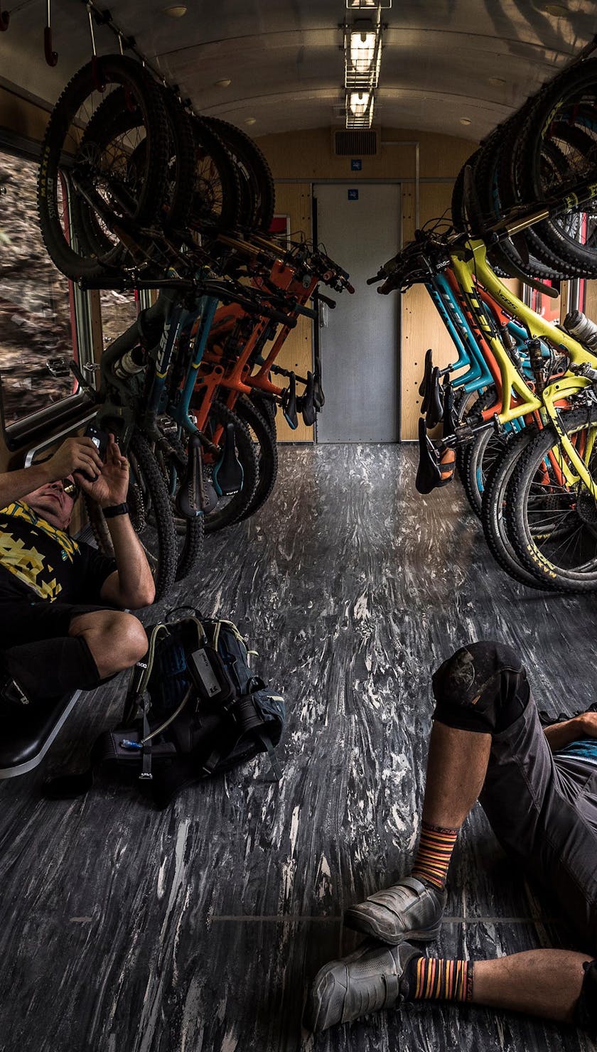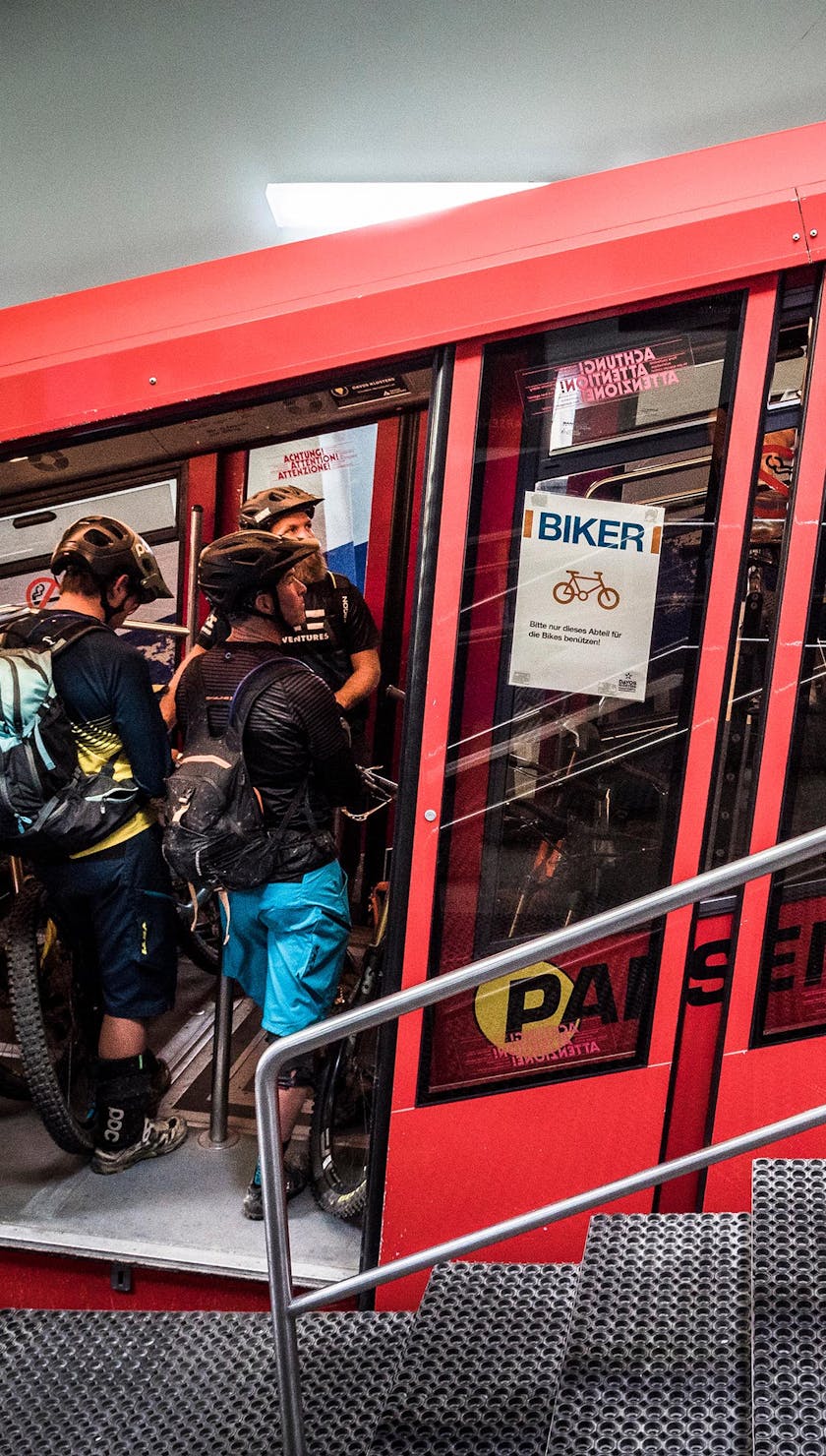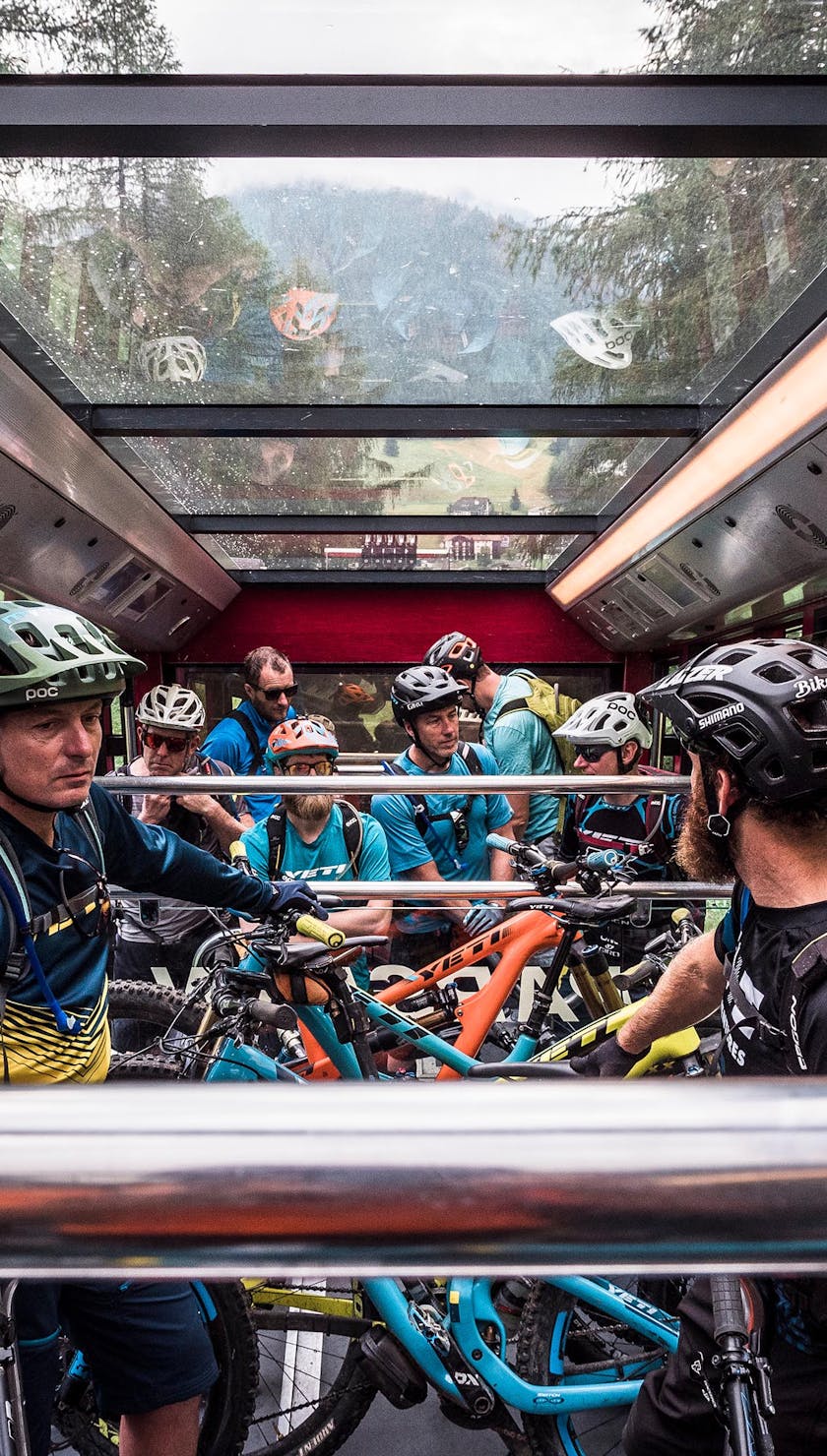 The Swiss do public transport well — too well in fact. But today it’s a reputation that’s come back to bite them in the ass. Gathered under the harsh, functional strip lights of the Parsenn funicular train we watch the minute hand tick on, unrelenting, to leave the scheduled departure time far behind. Bikes are lubed and lined up and our eagerness to ride cracks through the air like static before a lightning storm. ‘This is not very Swiss,” says Dave with a hint of the awkward, stealing the comment from everyone’s lips. We laugh, joke and stand patiently. And then stand some more; a jetsam and flotsam of grubby jerseys and pungent kneepads washed up among the brushed stainless railings and shiny red livery of a state-of-the-art train. Finally, the driver steps in, looking at least seventy years old and I figure there’s probably not much he hasn’t seen before, no matter how modern his train is. For a brief moment he seems to ponder the controls, presses some buttons, flicks some switches… and then without an explanation of the deviation from normal Swiss punctuality, we’re off.