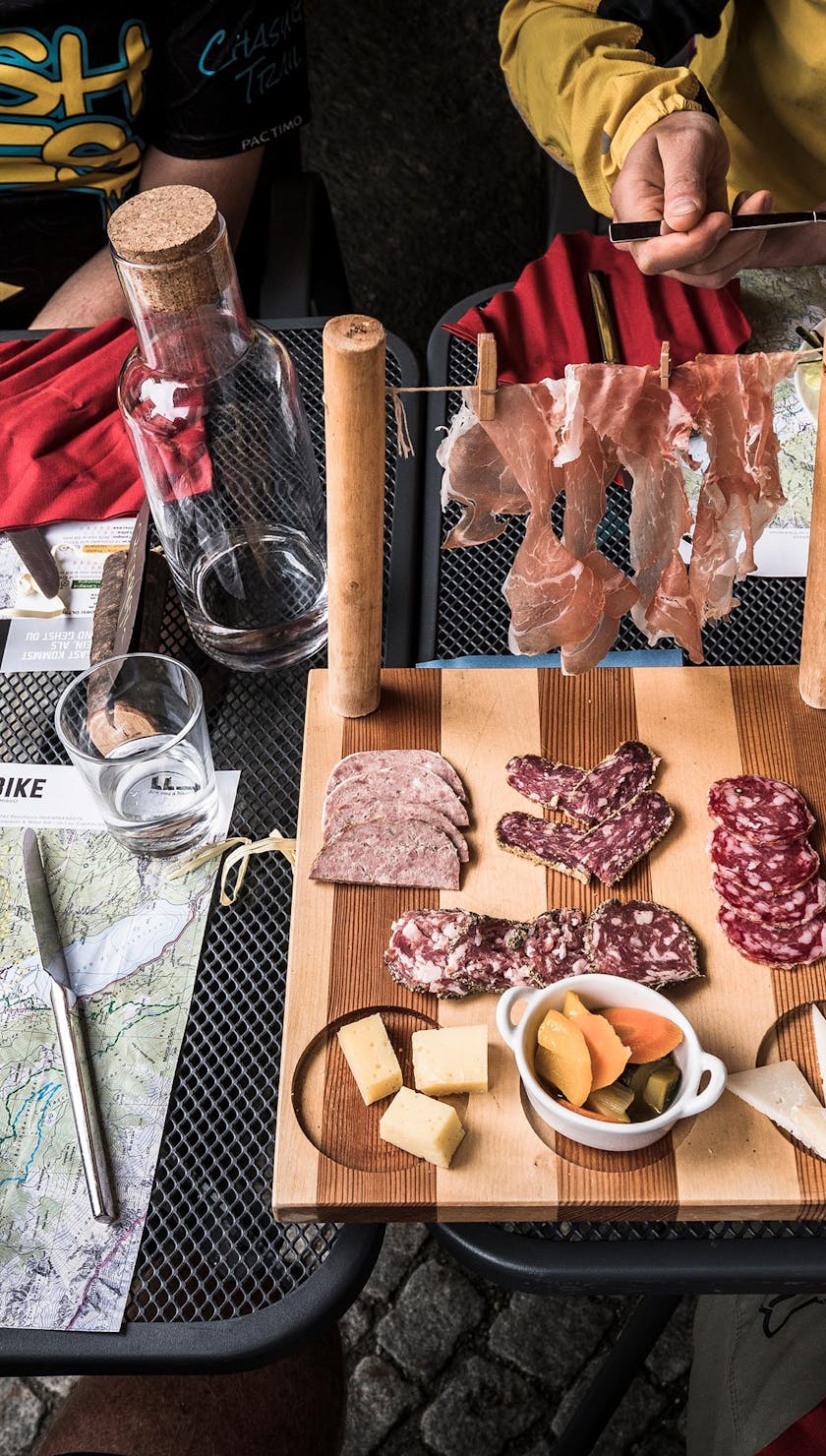 The payback is worth the wait. Our funicular glides effortlessly up 2000 feet of impossibly vertical mountainside, without so much as a rattle — as only a Swiss train could do. It burrows through thick fog to deliver us to the start of yet another day’s riding. It’s a day that, like all others on the trip, will boast an almost inexhaustible variety of trails —a five-star, eat–all-you-like buffet for the dirt hungry. Still enveloped in fog we stumble from the train straight into 45F temperatures and a steep gravel climb that quickly levels the whole group to labored breathing and some to pushing bikes. But this rude wake-up call is mercifully short. It leads us into a buff, undulating traverse that cuts west, winding its way through lava-lamp clouds that tumble and billow unpredictably across stark limestone buttresses. Riding in Switzerland is never boring. And thankfully, rarely without a mountain restaurant nearby for a re-fuel either.