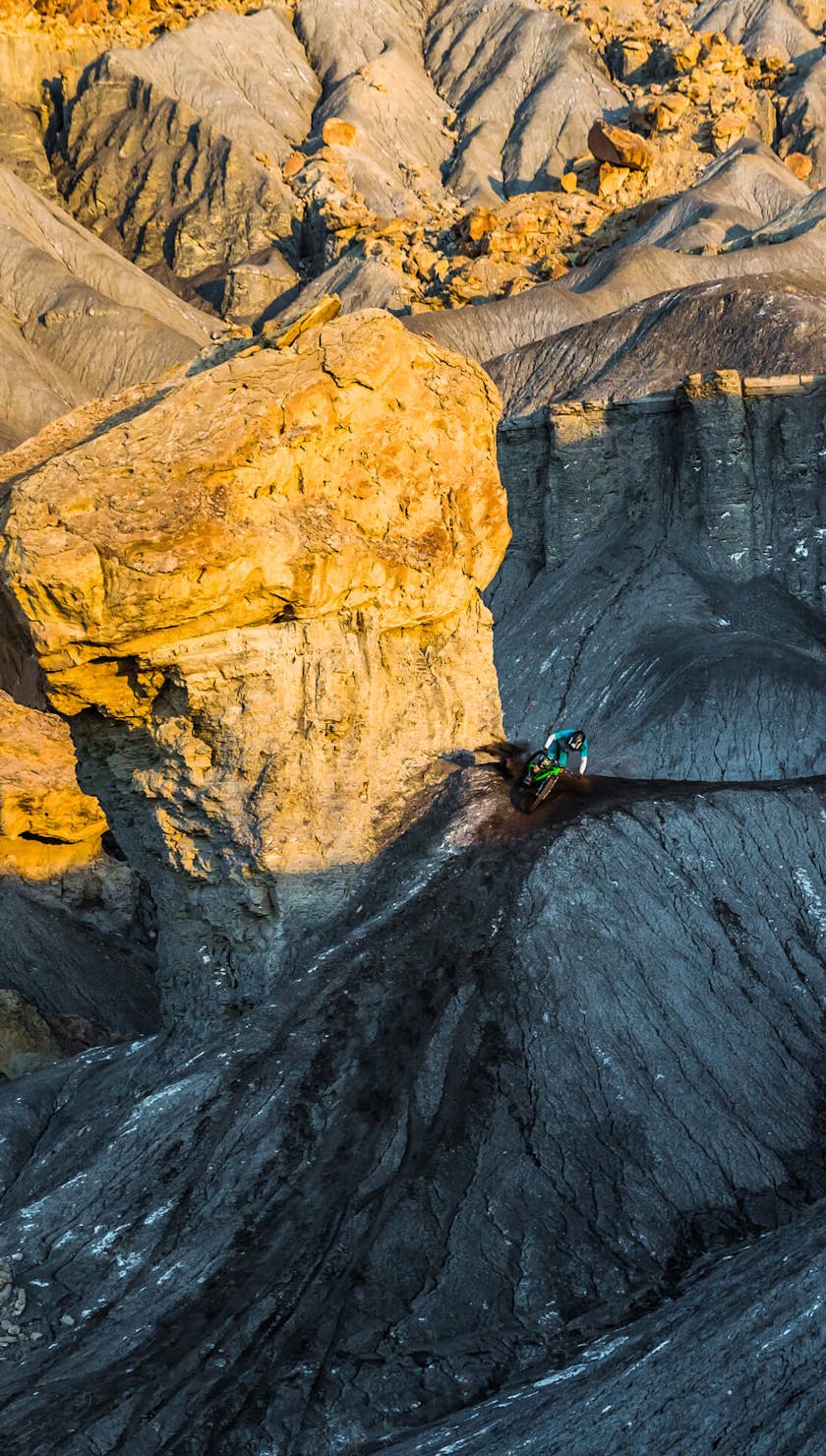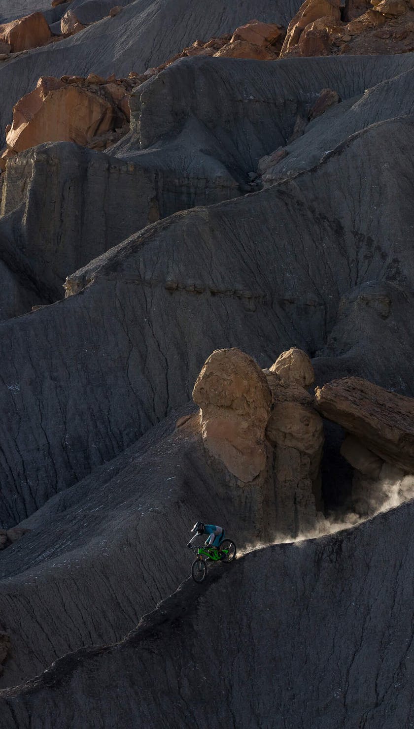 Green River, Utah has become well known over the years as one of the most iconic freeride mountain biking locations. Towering book cliffs, soft dirt, and complex terrain make for some of the most unique riding on earth. And while a full on DH rig is typically the bike of choice for such burly terrain, we had different plans.